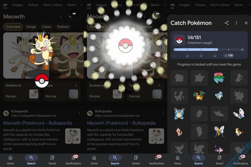 Google Search เพิ่มของเล่นสนุกๆ ประจำวัน เมื่อเราค้นหาชื่อ Pokemon (เฉพาะ Gen 1 จำนวน 151 ตัวแรกใน Pokedex) จะมี Pokemon ตัวนั้นโผล่ขึ้นมาให้จับบนหน้าจอ