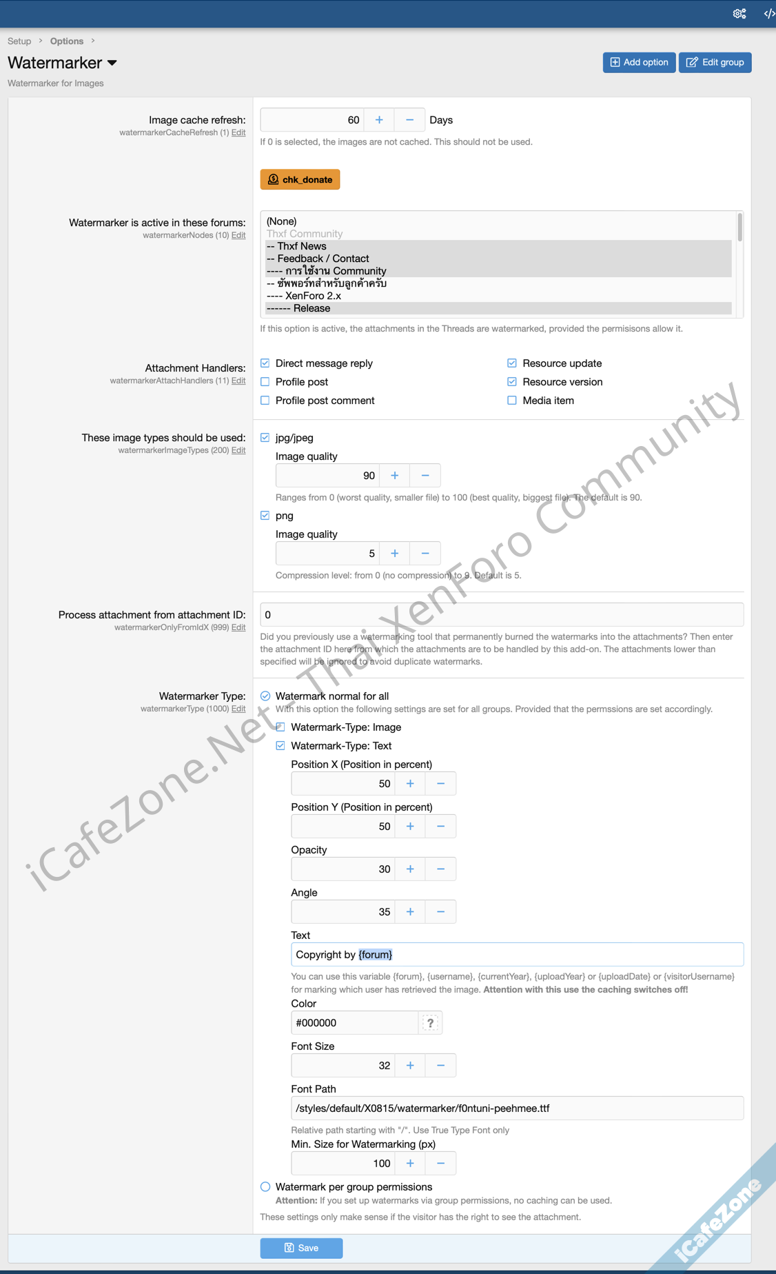 This happens on-the-fly and always in copy. So that at no time the original image is changed. Imags with watermarks are cached.