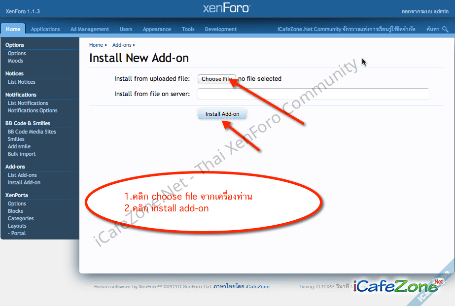 การติดตั้งตัวเสริม add-on ทำดังนี้ อันดับแรกให้เข้า admincp - install add-on แล้วทำตามภาพ วิธีการทํา การติดตั้งภาษาไทยใน xenforo วิธีการทํา การติดตั้งธีม Style