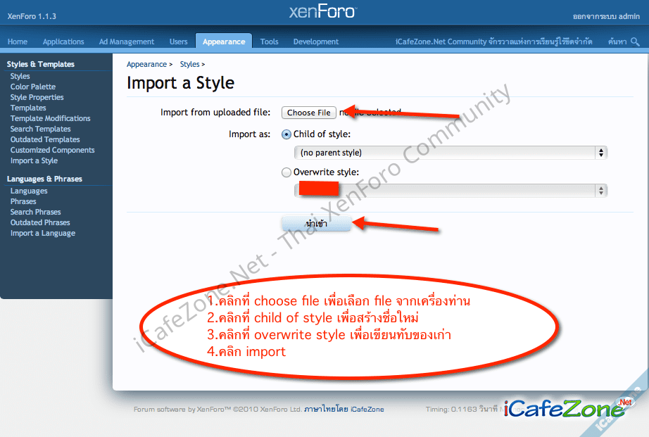 การติดตั้งธีม style ทำตามนี้ ให้เข้าไปที่ admincp - appearance - import a style แล้วตามภาพครับ วิธีการทํา การติดตั้งตัวเสริม Add-on วิธีการทํา How To Add A Custom Tab