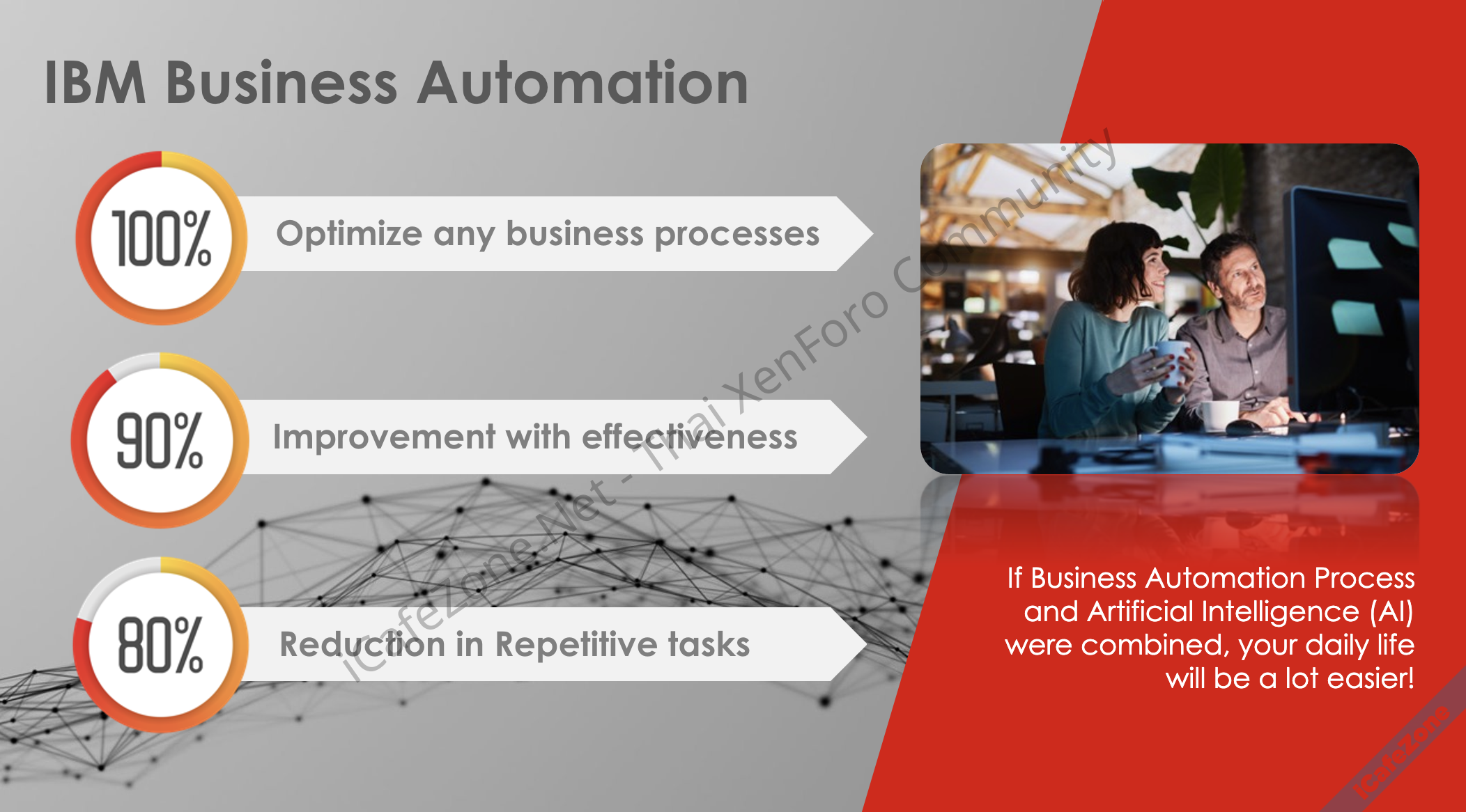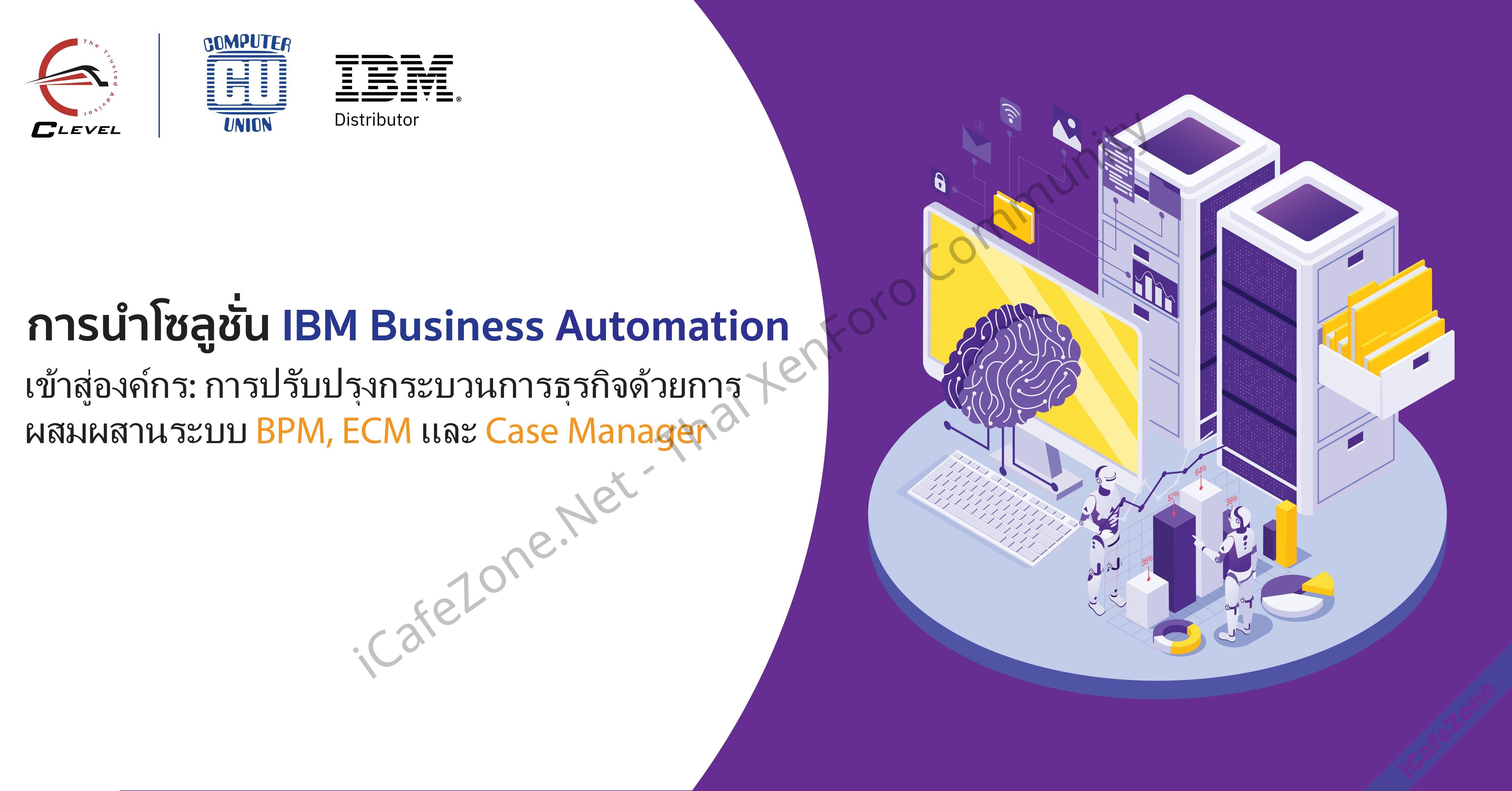 การผสมผสานระบบ BPM (Business Process Management) ECM (Enterprise Content Management) และ Case Manager สามารถช่วยปรับปรุงกระบวนการธุรกิจได้อย่างไร โดยเชื่อมโยงระบบเหล่านี้เข้าด้วยกัน เพื่อสร้างสิ่งที่เรียกว่า Intelligent Automation ซึ่งเป็นการใช้เทคโนโลยีและอัลกอริทึมเพื่อปรับปรุงและทำให้กระบวนการธุรกิจเป็นไปอย่างราบรื่นและมีประสิทธิภาพมากขึ้น โดย IBM Business Automation เป็นโซลูชั่นที่ช่วยลดความซับซ้อนของกระบวนการธุรกิจ และช่วยให้บริษัทสามารถปรับปรุงการปฏิบัติงานได้อย่างรวดเร็วและมีประสิทธิภาพมากยิ่งขึ้น