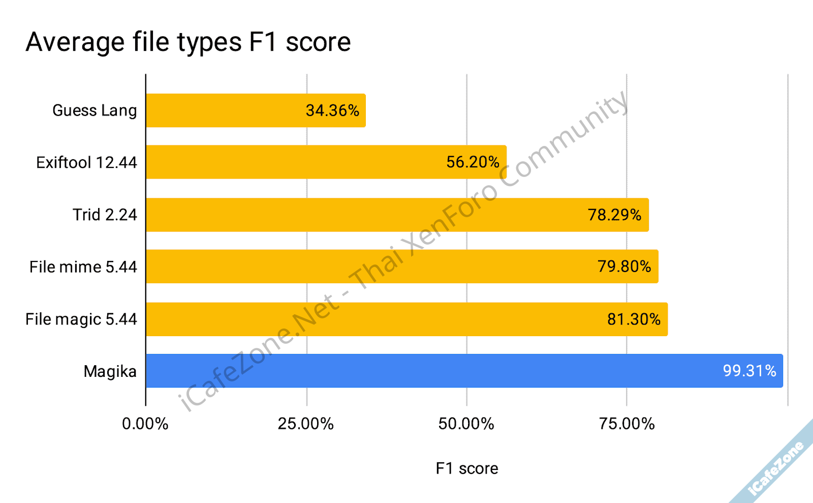 Magika เปลี่ยนแนวทางโดยอาศัยโมเดลปัญญาประดิษฐ์แบบ deep learning พัฒนาด้วย Keras และรันด้วย ONNX ตัวโมเดลที่ได้มีขนาดเพียง 1MB และคาดเดาชนิดไฟล์ได้ภายในไม่กี่มิลลิวินาทีแม้จะรันบนซีพียู ข้อดีสำคัญคือมันแม่นยำอย่างมาก โดยรวม F1-score สูงถึง 99.31% เทียบกับคำสั่ง file ที่ทำได้เพียง 81.30% เท่านั้น