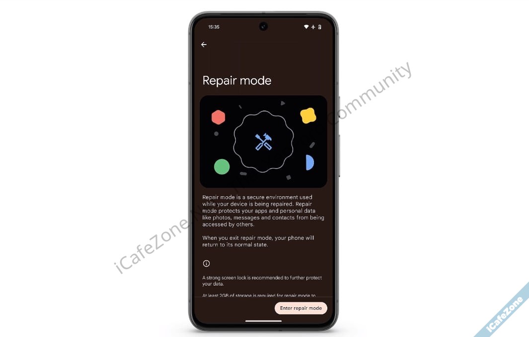 Pixel Repair Mode เป็นโหมดส่งซ่อมเครื่องเพื่อรักษาข้อมูลส่วนตัวไม่ให้ช่างมองเห็น เพื่อไม่จำเป็นต้องล้างเครื่องก่อนส่งซ่อม หรือยอมให้รหัสผ่านเข้าเครื่องแก่ช่างซ่อม