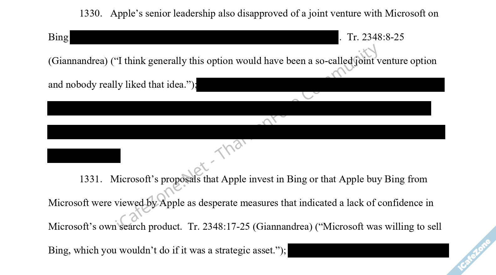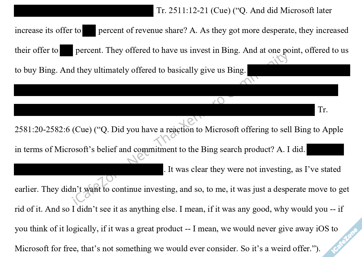เอกสารของกูเกิลระบุว่าไมโครซอฟท์พยายามเสนอ Bing เป็นเสิร์ชเอนจินหลักของ Safari และ iOS มาหลายครั้ง (2009, 2013, 2015, 2016, 2018, 2020) แต่ทุกครั้งแอปเปิลปฏิเสธ หลังทดลองใช้งานแล้วพบว่าคุณภาพของผลการค้นหา Bing แย่กว่ากูเกิลมาก อีกทั้งยังตามหลังเรื่องผลการค้นหาในหลายประเทศที่แอปเปิลทำธุรกิจอยู่ นอกจากนี้ แอปเปิลยังพบว่าไมโครซอฟท์มีพนักงานฝ่าย Bing ประมาณ 1,000 คน น้อยกว่าฝ่าย Google Search ที่มีพนักงาน 6,000 คนมาก แถมไมโครซอฟท์ยังดูไม่สนใจลงทุนใน Bing เพิ่มแต่อย่างใด
