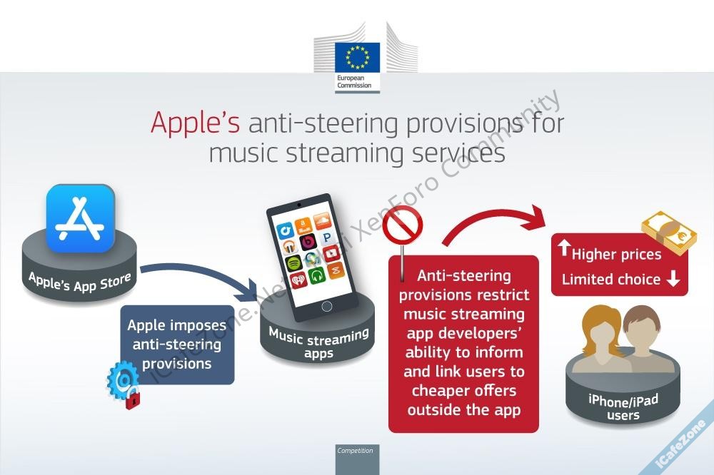 ได้แถลงการณ์นั้น EC บอกว่า แอปเปิลได้จำกัดแนวทาง ไม่ให้ผู้พัฒนาแอปแจ้งผู้ใช้งาน ถึงวิธีการจ่ายเงินในช่องทางอื่น หรือถ้ามีช่องทางที่ถูกกว่าแต่อยู่ภายนอกแอป ซึ่งแนวทางนี้ผิดกฎหมายผูกขาดทางการค้าของ EU
