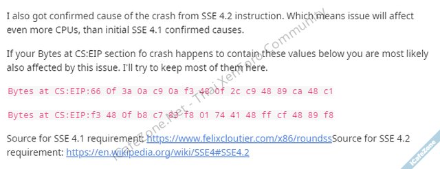 ผู้ใช้ Reddit นามว่า MinusPL ค่อนข้างมั่นใจว่าปัญหาดังกล่าวเกิดจากการรองรับการชุดคำสั่ง SSE 4.1 และ SSE 4.2