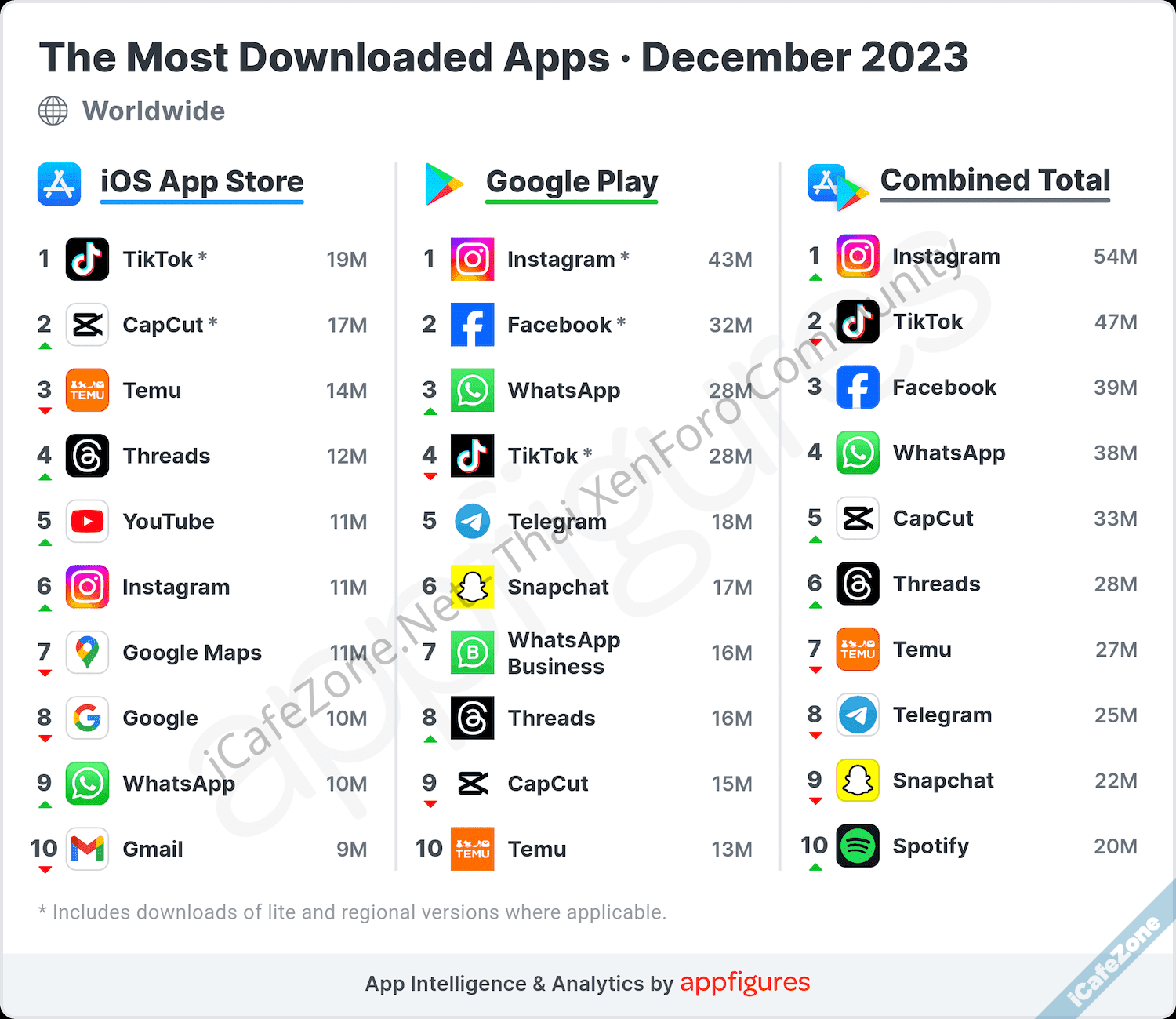 บริษัทวิจัยตลาดแอป Appfigures รายงานข้อมูลน่าสนใจของสถิติการดาวน์โหลดแอปในเดือนธันวาคม 2023 พบว่า Threads แอปโซเชียลเน้นตัวหนังสือของ Meta ที่ทำออกมาแข่งกับ X/Twitter มีจำนวนการดาวน์โหลดเพิ่มขึ้นถึง 3 เท่า เมื่อเทียบกับตัวเลขเดือนพฤศจิกายน มีจำนวนดาวน์โหลดรวม 28 ล้านครั้ง (iOS 12 ล้าน, Google Play 16 ล้าน)