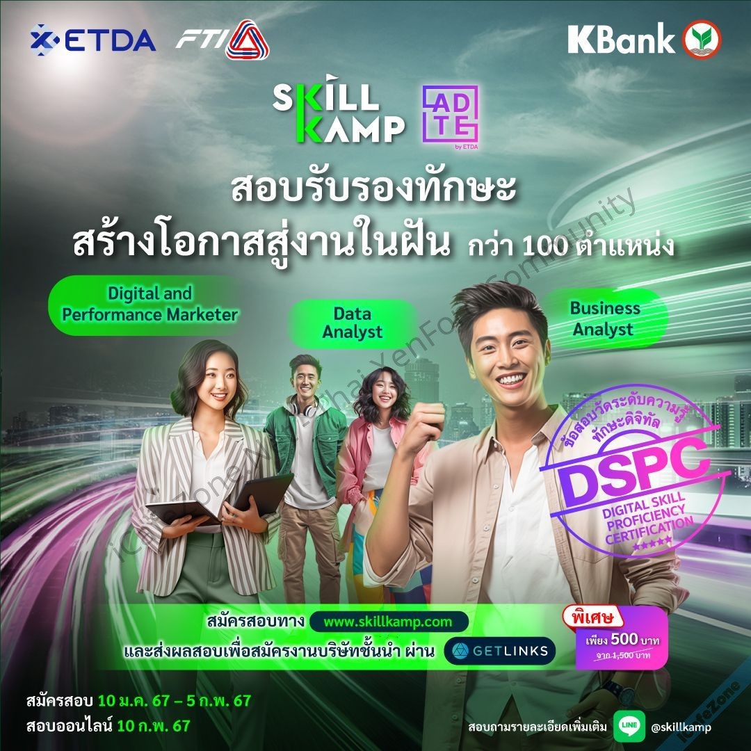 ย้ำอีกครั้งสำหรับผู้ที่สนใจอยากวัดระดับทักษะด้านดิจิทัลใน 3 สายงาน คือ Digital Marketing, Data Analyst และ Business Analyst สามารถสมัครสอบได้ตั้งแต่วันนี้ถึงวันที่ 5 กุมภาพันธ์ 2567 และจัดสอบออนไลน์ทั่วประเทศในวันที่ 10 กุมภาพันธ์ 2567 ผู้ที่ผ่านการทดสอบจะได้ใบรับรอง Digital Skill Proficiency Certification (DSPC) เพื่อใช้สมัครงานกับองค์กรธุรกิจชั้นนำกว่า 50 แห่ง กว่า 100 ตำแหน่งงาน คลิกไปสมัครได้ที่ https://www.zipeventapp.com/e/Digital-Skill-Proficiency-Certification-DSPC เป็นอีกหนึ่งโอกาสสำหรับคนรุ่นใหม่ที่ไม่ควรพลาด
