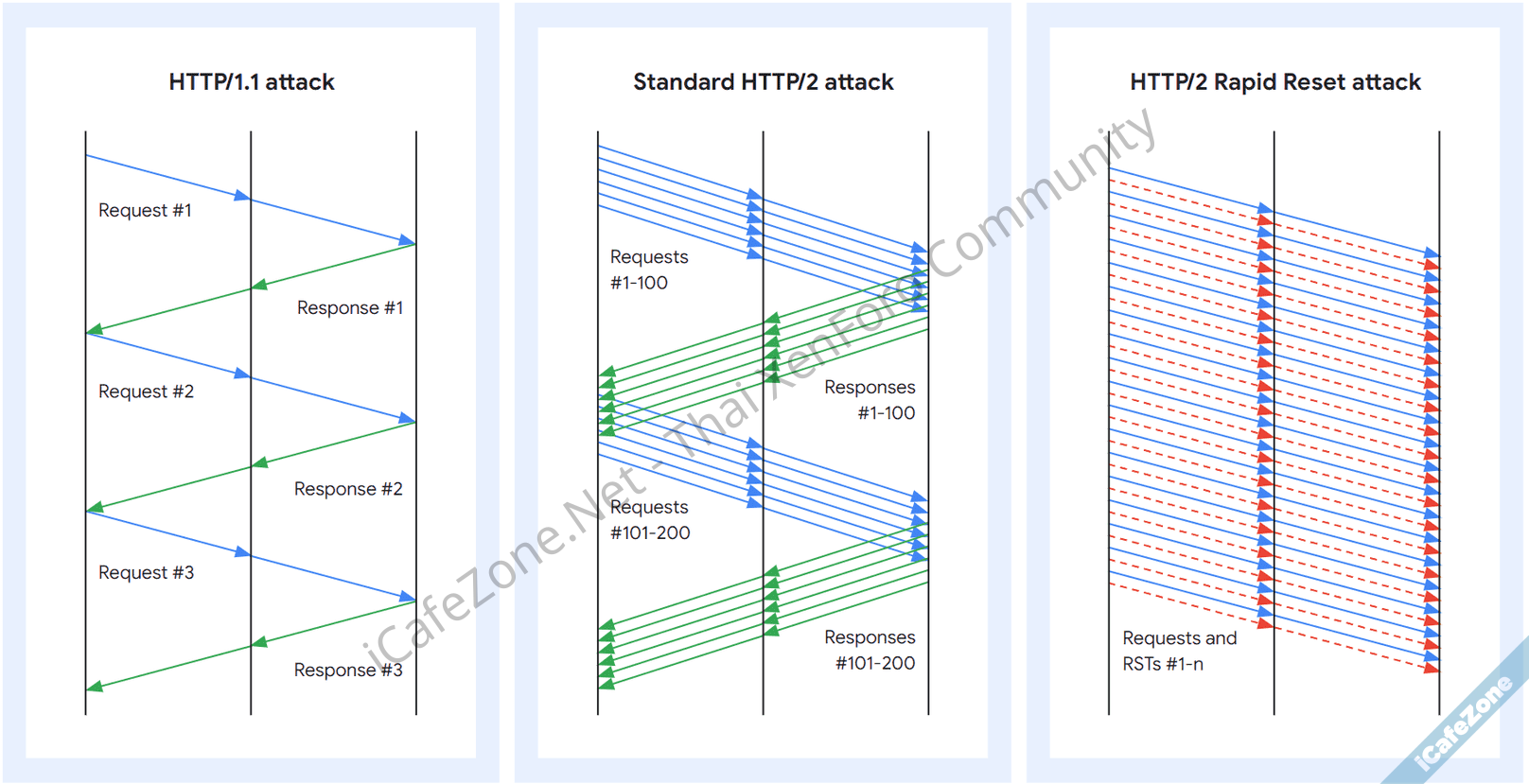 ผู้ให้บริการคลาวด์รายใหญ่นัดกันเปิดเผยข้อมูลช่องโหว่ DDoS ใน HTTP/2 CVE-2023-44487 เรียกชื่อว่า Rapid Reset อาศัยฟีเจอร์ stream ใน HTTP/2 ที่เปิดทางให้ไคลเอนต์สามารถขอเปิดสตรีมใหม่แล้วยกเลิกได้อย่างรวดเร็ว ทำให้ botnet ขนาดไม่ใหญ่มากก็สามารถสร้างรีเควสจำนวนมหาศาล