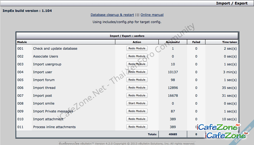 ดูไฟล์แนบ 647 ข้อมูลมาครบครับ แต่ต้องตามแก้ไขหลายอย่างเลย เช่น พวก tag video ต้องตามแก้ใหม่ พวก usergroup ต้องตามย้ายใหม่เพราะไม่ตรง พวก permittion ต้องตามแก้ไขและตั้งค่าใหม่ พวก file attach ต้องตามตั้งค่าใหม่ แก้ไข link ใน post สิ่งสำคัญคือ ต้องทำการ reset password ทุก user ______