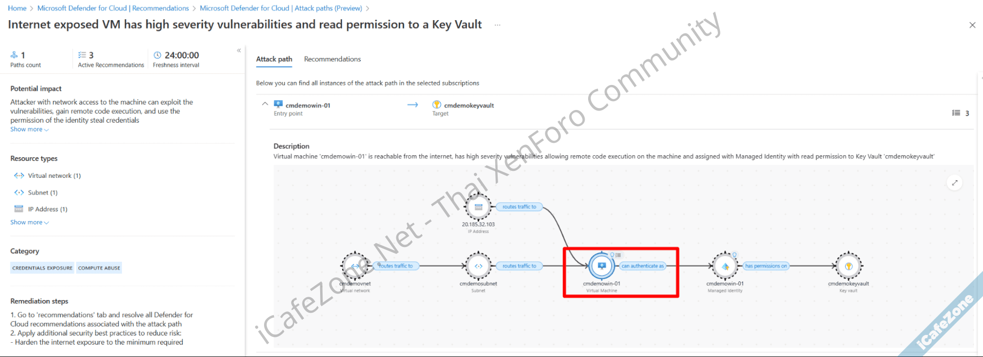 การวิเคราะห์เส้นทางการโจมตีที่มีความเสี่ยงสูง ทำให้ผู้ดูแลระบบสามารถโฟกัสกับการแก้ปัญหาส่วนที่มีความเสี่ยงสูงได้อย่างแม่นยำ เช่น เซิร์ฟเวอร์ที่มีสิทธิระดับสูง หรือระบบฐานข้อมูลที่มีข้อมูลสำคัญกลับเปิดรับการเชื่อมต่อจากอินเทอร์เน็ตโดยตรง ฟีเจอร์ Attack path analysis ของ CSPM ก็สามารถวิเคราะห์ความเสี่ยงเหล่านี้ออกมาให้ผู้ดูแลเห็นภาพได้ทันที
