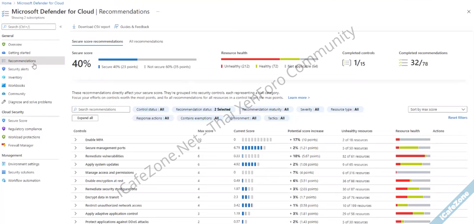 CSPM แจ้งปัญหาและความสำคัญให้กับผู้ใช้ด้วยระบบให้คะแนน หรือ Secure Score ที่เรียงตามลำดับความสำคัญของการปรับปรุงความปลอดภัยแบบต่างๆ ไมโครซอฟท์จะแสดงคำแนะนำให้ทำอะไรบ้างเพื่อแก้ไขความเสี่ยงแต่ละข้อ และความเสี่ยงของแต่ละข้อนั้นกระทบกับทรัพยากรใดในระบบไอทีขององค์กรบ้าง โดยฟีเจอร์ Secure Score นี้อยู่ในแพ็กเกจเบื้องต้นที่ใช้งานได้โดยไม่มีค่าใช้จ่าย