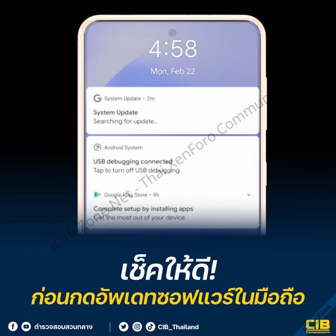 ตำรวจสอบสวนกลาง (CIB) ประกาศเตือนผู้ใช้งานมือถือระบบแอนดรอยด์ เนื่องจากตอนนี้มีมิจฉาชีพส่งข้อความหลอกให้ผู้ใช้กดอัปเดตซอฟแวร์ และถ้าผู้ใช้กดข้อความ มิจฉาชีพจะสามารถขโมยข้อมูลจากโทรศัพท์ไปได้