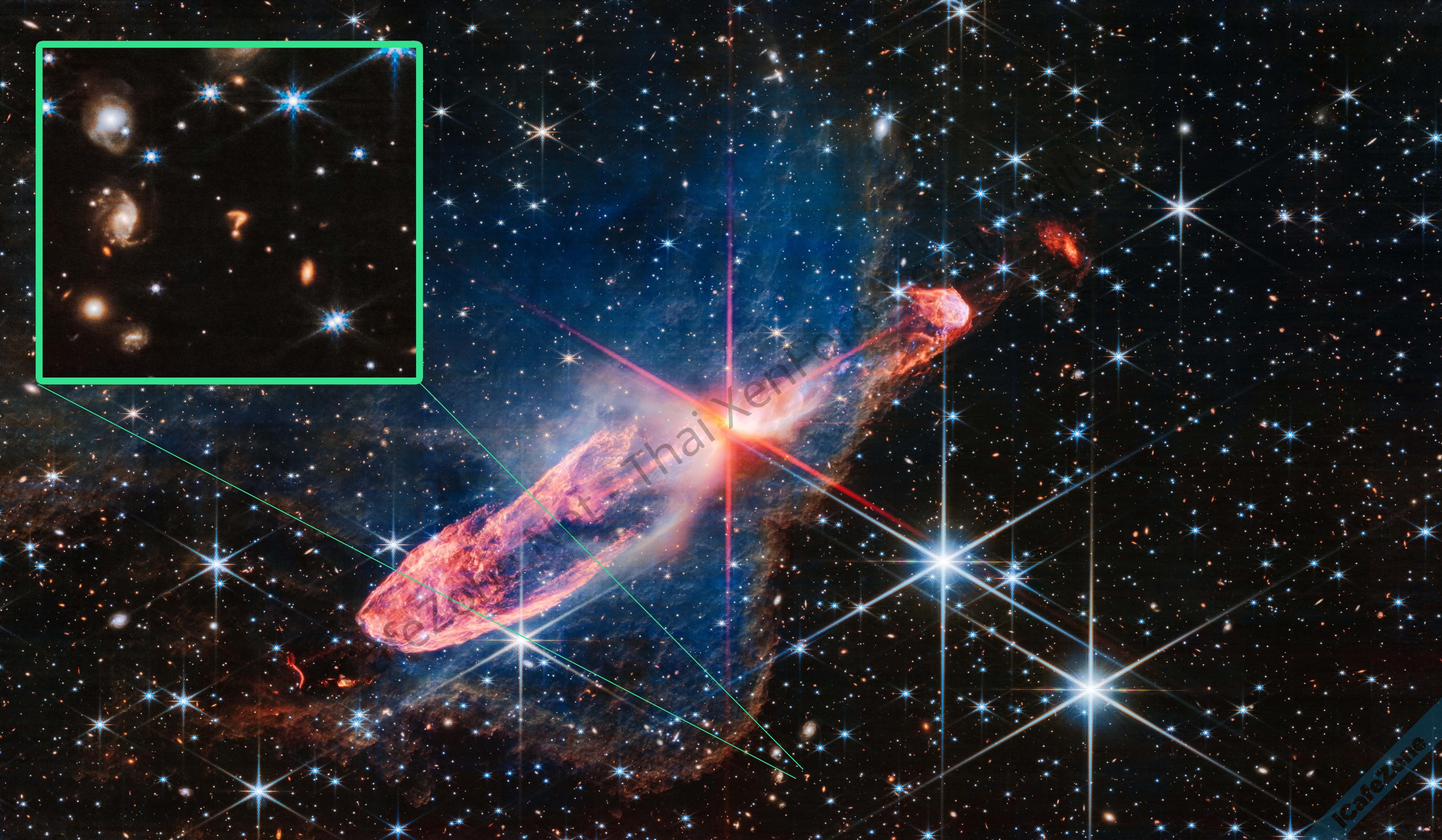 สัปดาห์ที่แล้ว European Space Agency เผยแพร่ภาพชุดล่าสุดจากกล้อง JWST ปล่อยภาพจุดกำเนิดของดาวฤกษ์ Herbig-Haro 46/47 ในกลุ่มดาว Vela ห่างจากโลกราว 1,470 ปีแสง ที่น่าสนใจคือภายในภาพ หากซูมเข้าไป จะพบเทหวัตถุที่เป็นรูปเครื่องหมายคำถาม "?" เล็กๆ อยู่ด้วย