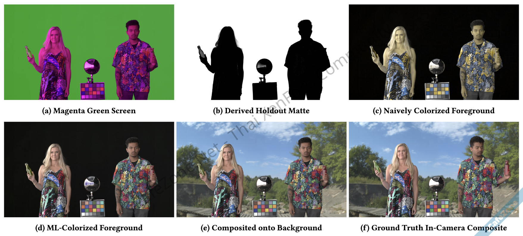 กระบวนการแยกแยะวัตถุจะเริ่มด้วยการจับฉากหลังเฉพาะสีเขียว ทำให้วัตถุฉากหน้าทั้งหมดที่ถูกย้อมสีจะมองเป็นสีดำ อีกขั้นตอนคือการซ้อนด้วยภาพที่แยกด้วยสีแดง-น้ำเงิน เพื่อหาวัตถุฉากหน้า ตำแหน่งต่าง ๆ จึงมีความชัดเจนมากขึ้น ขั้นตอนสุดท้ายคือการถอดวัตถุฉากหน้าที่ย้อมสีมาเจนต้าให้ออกมาเป็นสีปกติ โดยใช้ AI รวบรวมฟุตเทจภาพในแสงสีขาวปกติก่อน นำมาประมวลผลรวมกัน ทำให้แม้นักแสดงใส่ชุดสีเขียว ถือขวดแก้วใส สยายผม ภาพที่ซ้อนออกมาทั้งหมดก็คงความสมจริงมากขึ้น