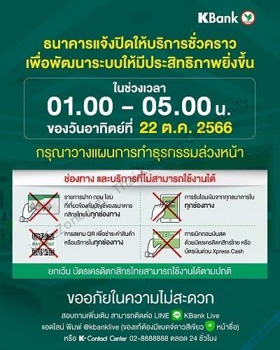 ธนาคารกสิกรไทยแจ้งจะปิดให้บริการชั่วคราวเพื่อพัฒนาระบบในวันอาทิตย์ที่ 22 ตุลาคม 2566 เวลา 01:00 น. – 05:00 น. ส่งผลให้ผู้ใช้ไม่สามารถใช้บริการตามนี้