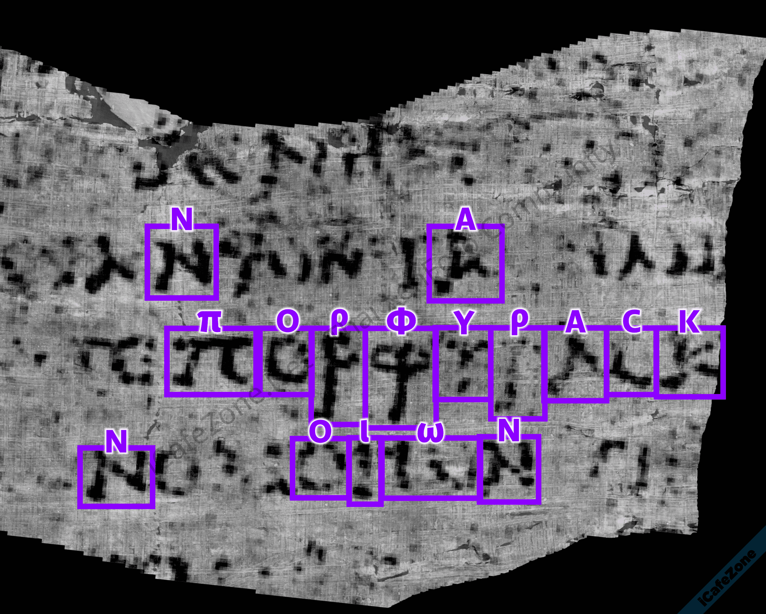คำที่พบคำแรกคือคำว่า “ΠΟΡΦΥΡΑϹ” แปลว่าสีม่วง แต่ก็ยังมีข้อถกเถียงว่าอาจจะเป็นคำอื่นที่เขียนใกล้เคียงกัน และเนื่องจากไม่มีบริบทรอบข้างทำให้ยังสรุปชัดเจนไม่ได้