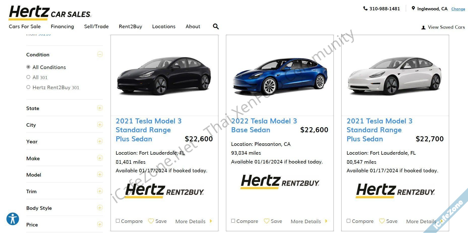 รถยนต์ไฟฟ้าของ Hertz มีด้วยกันหลากหลายรุ่น แต่ส่วนใหญ่คือ Tesla Model 3 ที่ Hertz ซื้อมาล็อตใหญ่ 100,000 คันในปี 2021 โดย Hertz เปิดให้ดูข้อมูลและซื้อผ่านเว็บไซต์ได้ ราคาต่ำสุดเท่าที่มีรายงานคือ 17,700 ดอลลาร์ (ขณะที่เขียนข่าว ราคาต่ำสุดบนหน้าเว็บคือ 22,600 ดอลลาร์) ซึ่งถือว่าถูกกว่าราคารถมือหนึ่งบนหน้าเว็บ Tesla (ปัจจุบันคือ 35,900 ดอลลาร์) อยู่มาก