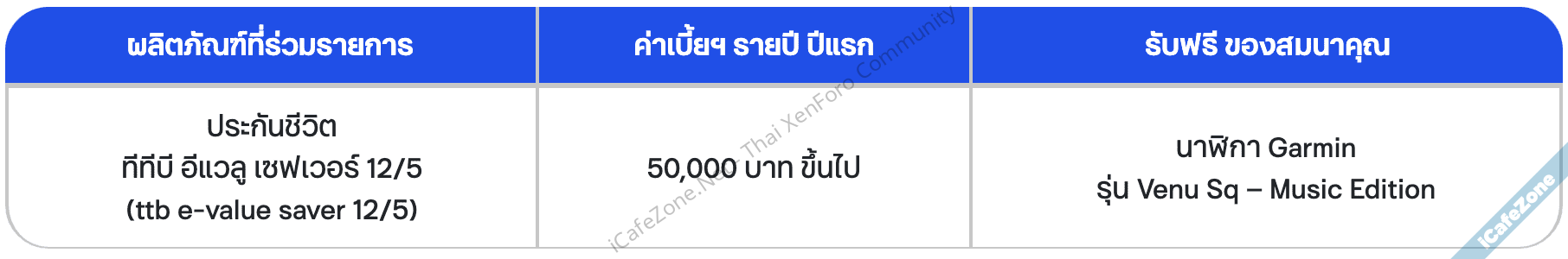 สำหรับผู้ที่ทำประกัน ttb e-value saver 12/5 ภายใน 31 พ.ค. 66 นี้ จะได้รับนาฬิกา Garmin รุ่น Venu Sq - Music Edition มูลค่า 8,490 บาท อีกด้วย ดูรายละเอียดได้ที่นี่ https://www.ttbbank.com/th/promotion/detail/e-value-saver-12-5