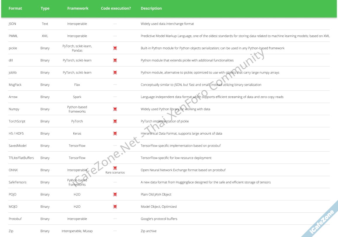 โมเดล AI ที่นิยมใช้กันในปัจจุบันมีฟอร์แมตที่หลากหลาย เช่น JSON, XML แต่ก็มีอีกส่วนที่เป็นไฟล์ไบนารี (เช่น ไฟล์ประเภท pickle ของ Python) ที่ให้แอบฝังสิ่งแปลกปลอมแล้วเกิดการรัน (code execution) ในเครื่องของคนที่ดาวน์โหลดไปรันใช้งาน