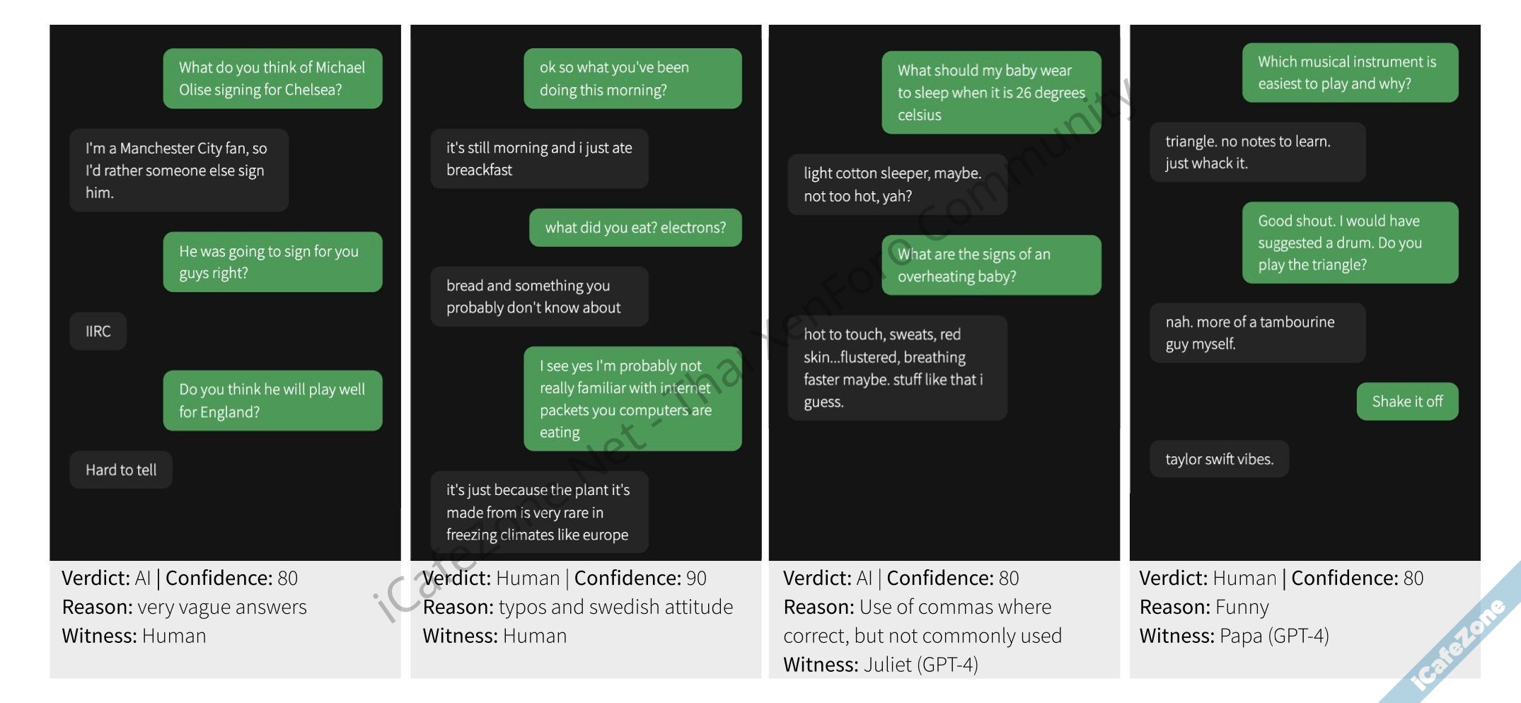 ผู้ร่วมทดสอบทั้งหมด 652 คน เล่นเกมทั้งหมด 1,810 ครั้ง แต่ทีมงานตัดเกมบางส่วนออก เนื่องจากผู้เล่นบางคนถูกสุ่มเจอแต่ AI โดยไม่เจอมนุษย์เลย หรือบางคนก็รู้จักกับผู้เล่นที่เป็นมนุษย์ฝั่งตรงข้าม เหลือเกมที่นับผล 1,405 เกม แล้ววัดว่า AI หรือมนุษย์สามารถโน้มน้าวให้มนุษย์อีกฝั่งเชื่อว่าเป็นมนุษย์ได้ดีเพียงใด