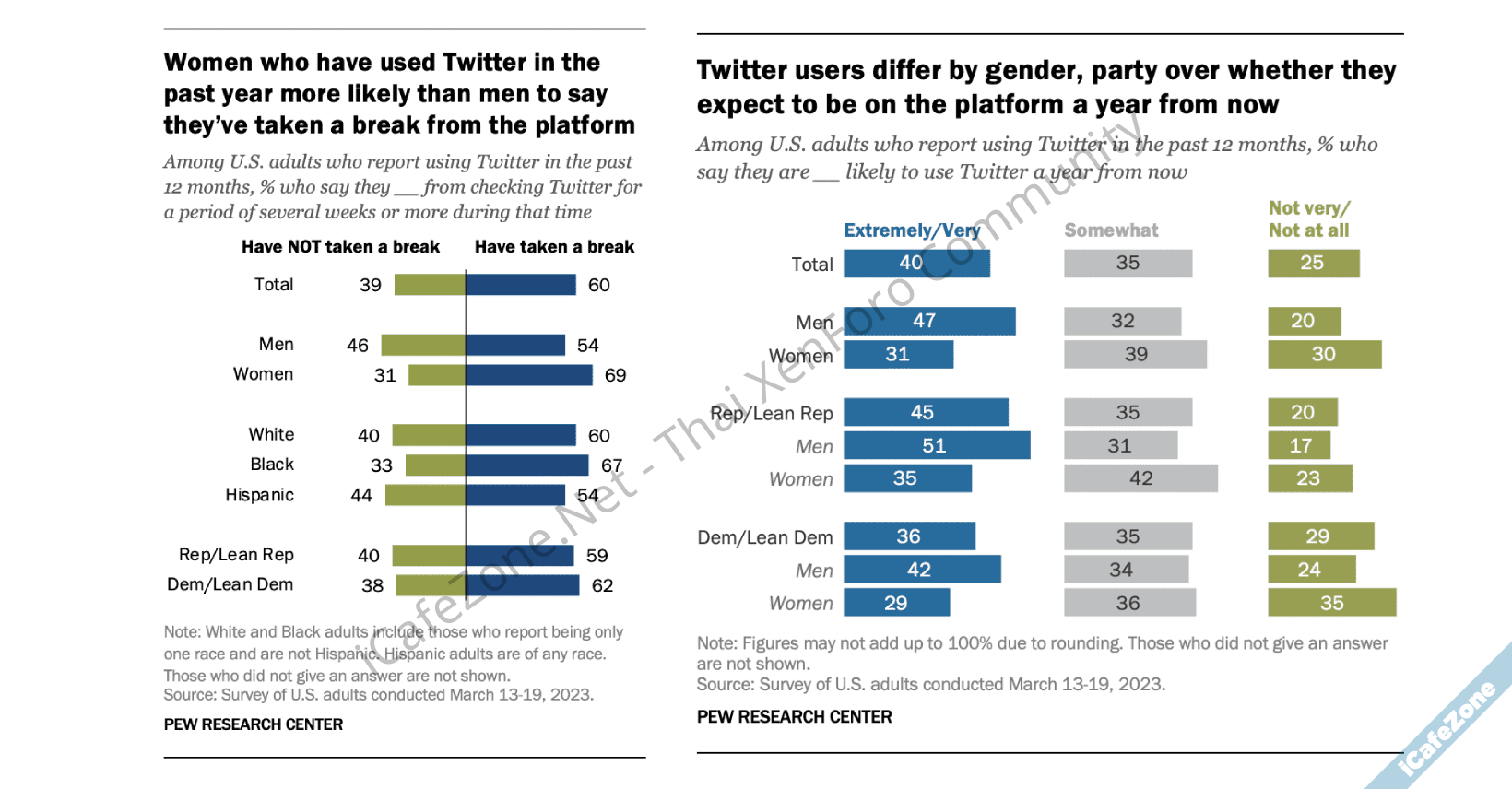 หกในสิบ (60%) ของคนสหรัฐฯ ที่ร่วมการสำรวจบอกว่า ได้หยุดใช้ Twitter มาหลายสัปดาห์หรืออาจจะมากกว่านั้น แต่ผู้ใช้อีกส่วนหนึ่งประมาณสี่ในสิบ (39%) บอกว่ายังคงใช้งาน Twitter อยู่ (การสำรวจในช่วงวันที่ 13-19 มีนาคม 2023 ที่ผ่านมา)