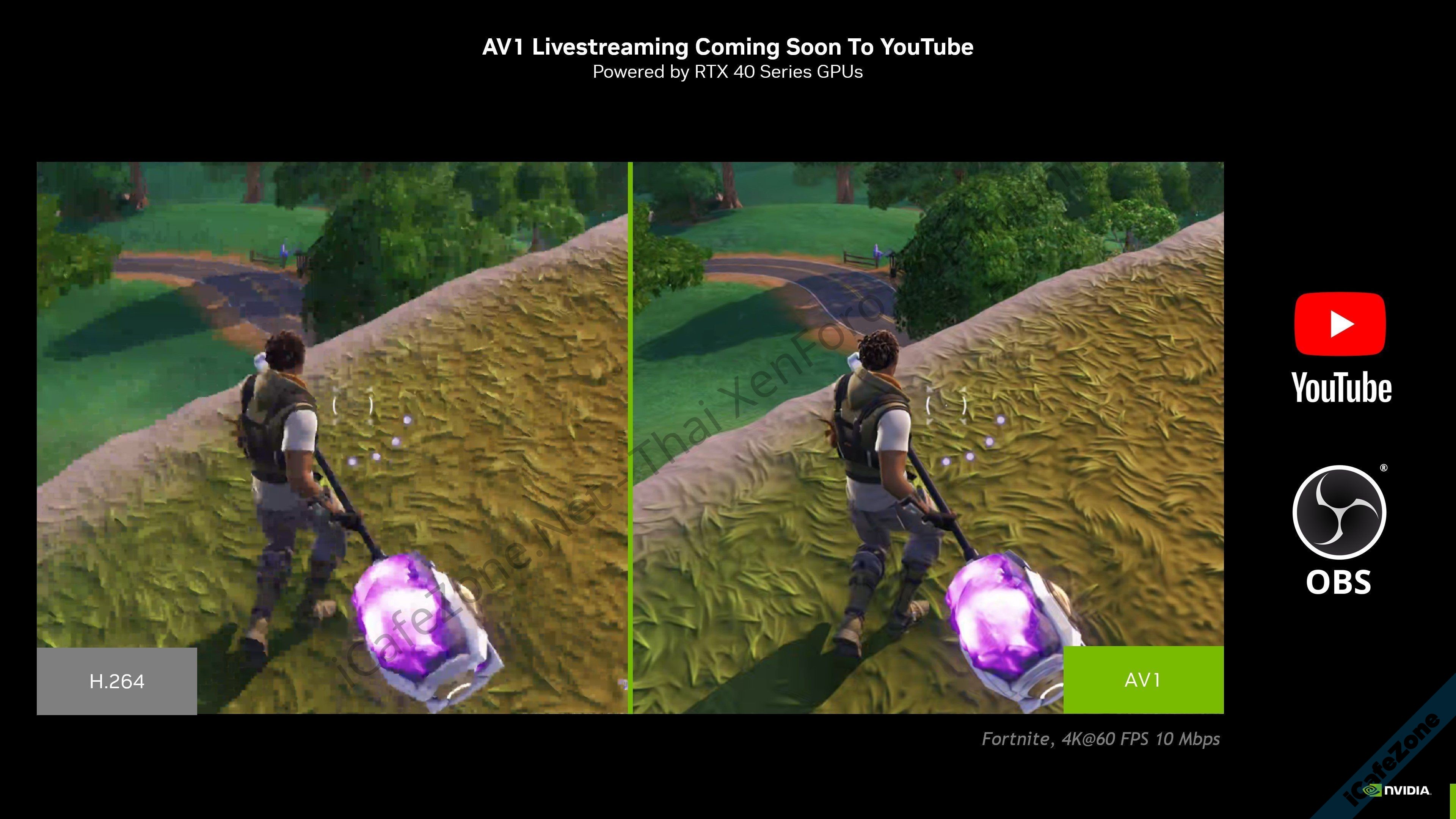 OBS Studio รองรับ AV1 กับจีพียูทั้ง 3 ค่ายใหญ่ แต่ NVIDIA ก็ระบุว่าทำงานอย่างใกล้ชิดกับ OBS และ YouTube เพื่อให้การ์ดจอ GeForce RTX ซีรีส์ 40 สามารถสตรีม AV1 ได้อย่างราบรื่น