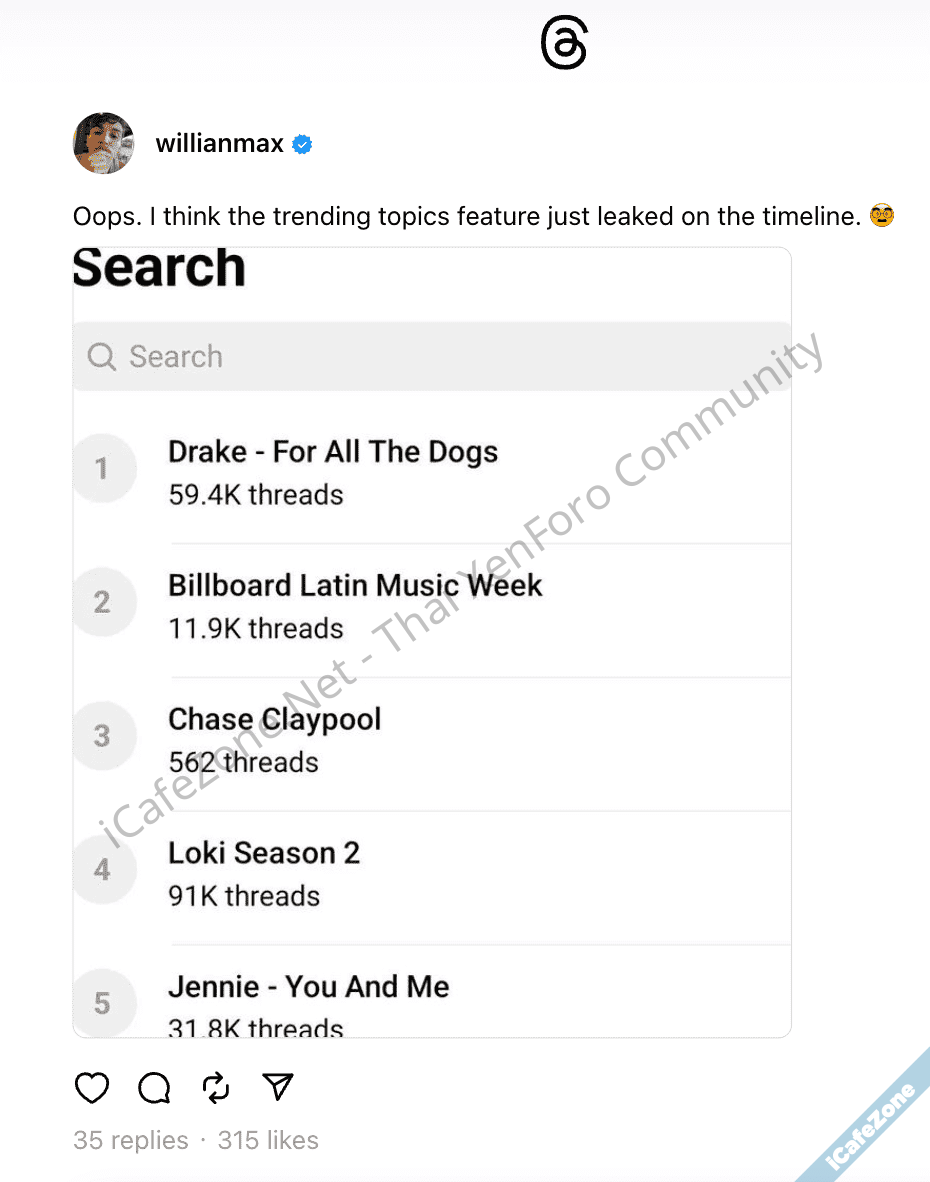 ผู้ใช้งาน Threads ชื่อ Willianmax โพสต์รูปหน้าฟีเจอร์ Trending ของ Threads แสดงอันดับหัวข้อที่กำลังเป็นกระแสและระบุจำนวนจำนวนโพสต์ในแต่ละหัวข้อ คล้ายกับหน้าเทรนด์ของแอป X ซึ่ง Willianmax บอกว่าเขาไม่ได้เป็นคนโพสต์ แต่ไปเห็นรูปนี้จากโพสต์ของพนักงาน Meta ที่เขาติดตามอยู่ ซึ่งต่อมารูปนี้ถูกลบออกไปจากโพสต์ต้นฉบับและทาง Meta ยังไม่ออกมายืนยันถึงฟีเจอร์นี้