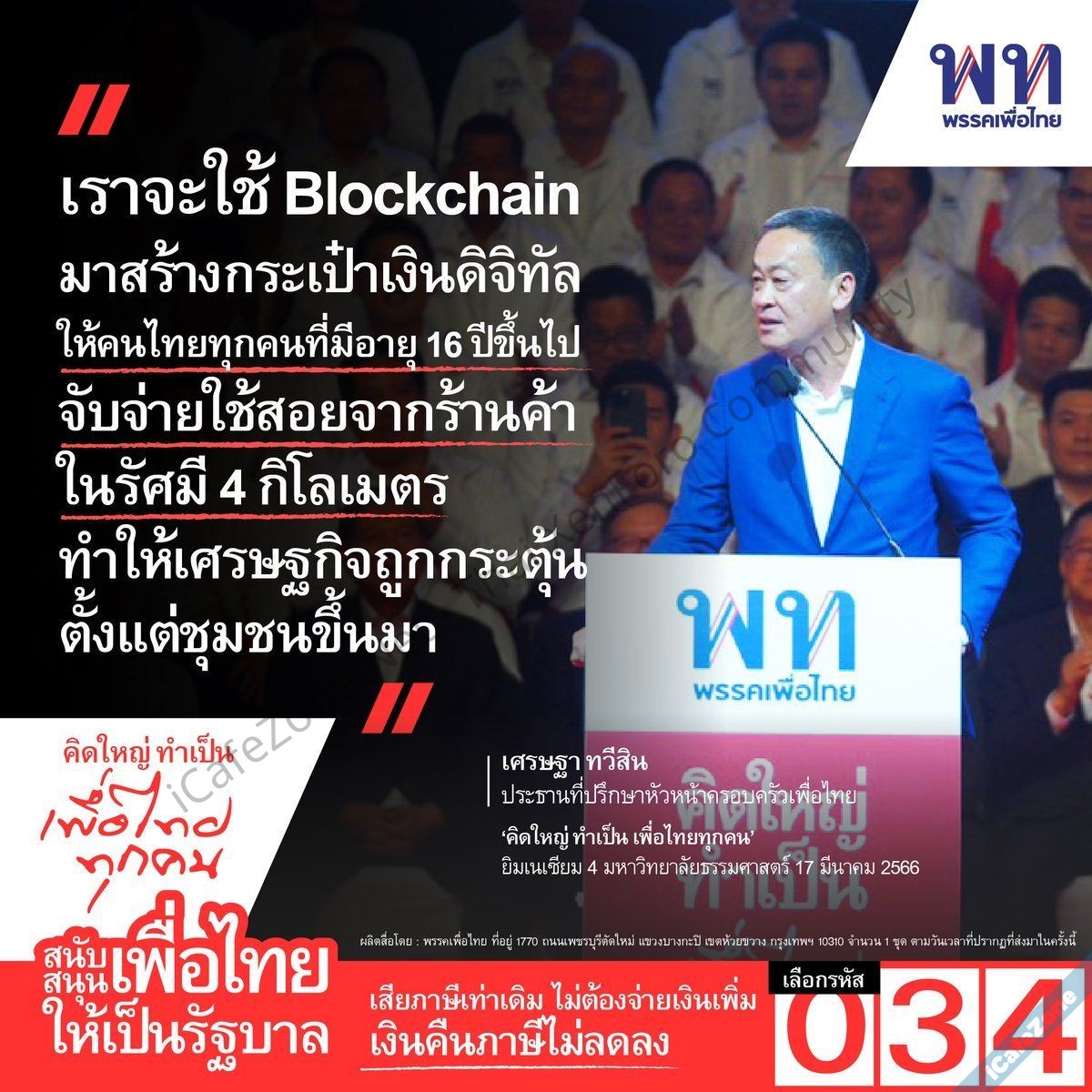 พรรคเพื่อไทย ประกาศนโยบาย "ประเทศไทยเป็น Blockchain Hub แห่งอาเซียน" เพื่อเปิดโอกาสให้คนไทยระดมทุนจากทั่วโลกโดยไม่ต้องผ่านระบบธนาคารแบบเดิม ส่งเสริมให้ศิลปินไทยขายงานเป็น NFT ไปยังตลาดโลกได้