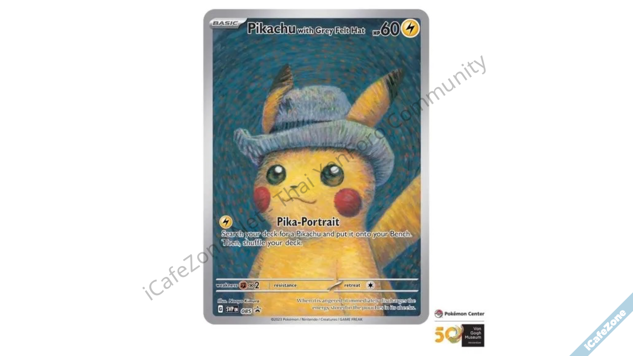 การ์ด Pika-Portrait ที่ว่าเป็นพิคาชูสวมหมวกสักหลาดสีเทา แสดงท่าทางที่ได้รับแรงบันดาลใจจากภาพดังของแวนโก๊ะ โดยจะแจกให้กับผู้เยี่ยมชมที่ทำภารกิจรอบพิพิธภัณฑ์ได้สำเร็จ