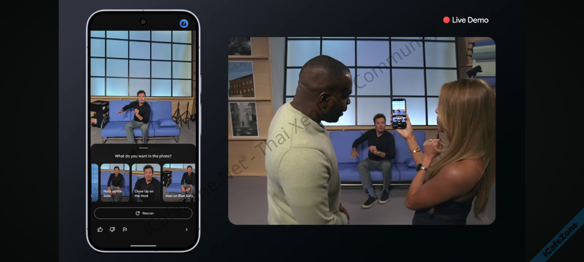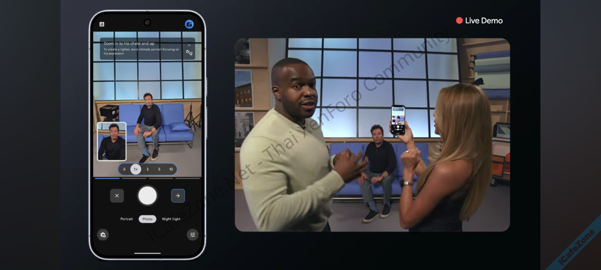 ในงานเปิดตัวได้โชว์ฟีเจอร์นี้โดยให้ Jimmy Fallon โพสท่าบนโซฟาแล้วให้ Alex Cooper นักจัดรายการพ็อดแคสต์ชื่อดังมาถ่ายรูปให้ เมื่อเปิดกล้องแล้วเข้าฟีเจอร์ Camera Coach AI จะวิเคราะห์ภาพโดยรวมและจะมีตัวเลือกให้หลายๆ มุมว่าต้องการถ่ายแบบใด เช่นถ่ายโคลส-อัพ, ถ่ายติดฉากหลัง ฯลฯ เมื่อเลือกมุมที่ต้องการแล้ว AI จะขึ้นข้อความให้ว่าต้องหันกล้องไปมุมไหน, ขยับมือถือขึ้นหรือลง, ซูมกี่เท่า, ใช้เลนส์ใด เมื่อ AI เห็นว่าสวยตามโจทย์แล้วจะสั่งให้ผู้ใช้กดชัตเตอร์