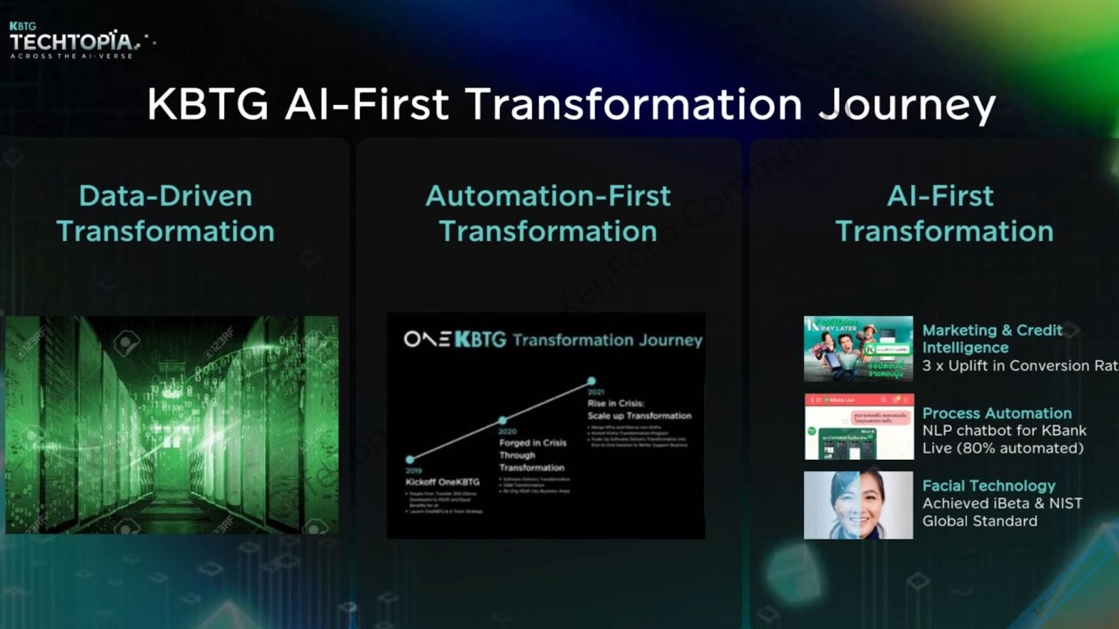กระทิง บอกว่า KBTG ทำสิ่งที่เรียกว่า AI-First Transformation เพื่อเตรียมความพร้อมองค์กรสู่การเป็น AI-First Company ตั้งแต่การทำ Data Driven เพราะ AI จะเก่งขึ้นได้พื้นฐานสำคัญที่สุดต้องมีข้อมูลที่เรียกว่ามหาศาล และต้องเป็นข้อมูลที่สามารถนำไปใช้ประโยชน์ได้จริง และ KBTG ยังผ่านการทำ Automation-First เรียกว่าทุกอย่างสามารถทำงานได้แบบอัตโนมัติ จนปัจจุบันอยู่ในระดับ AI-First เห็นได้จากหลากหลายบริการของ KBank ที่ตอบสนองความต้องการของผู้บริโภคได้ดีขึ้น เช่น Chatbot ที่ช่วยแก้ปัญหาให้ลูกค้าได้ หรือเทคโนโลยี Facial Technology ที่ได้มาตรฐานระดับโลก