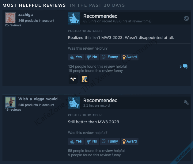 ขณะเดียวกันในแพลตฟอร์มของ Steam มีผู้ใช้ออกบทวิจารณ์ใหม่ และเชิงบวกสำหรับ Modern Warfare 3 ปี 2011 เพื่อชี้ให้เห็นว่ามันดีกว่าภาค 2023 โดยมีบางส่วนเขียนบทวิจารณ์ว่า "ตระหนักดีว่านี่ไม่ใช่ MW3 2023 เกมไม่น่าผิดหวังเลย" และ “ฉันกลับมาเล่นแคมเปญภาคนี้ เพราะแคมเปญภาคใหม่แย่มาก”