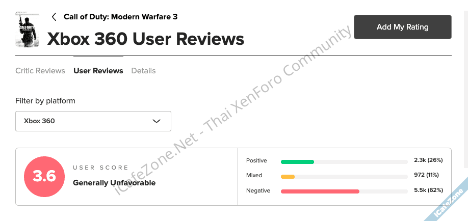 เว็บ Metacritic ในส่วนรีวิวฝั่งผู้ใช้งานของเกม Call of Duty: Modern Warfare 3 (2011)