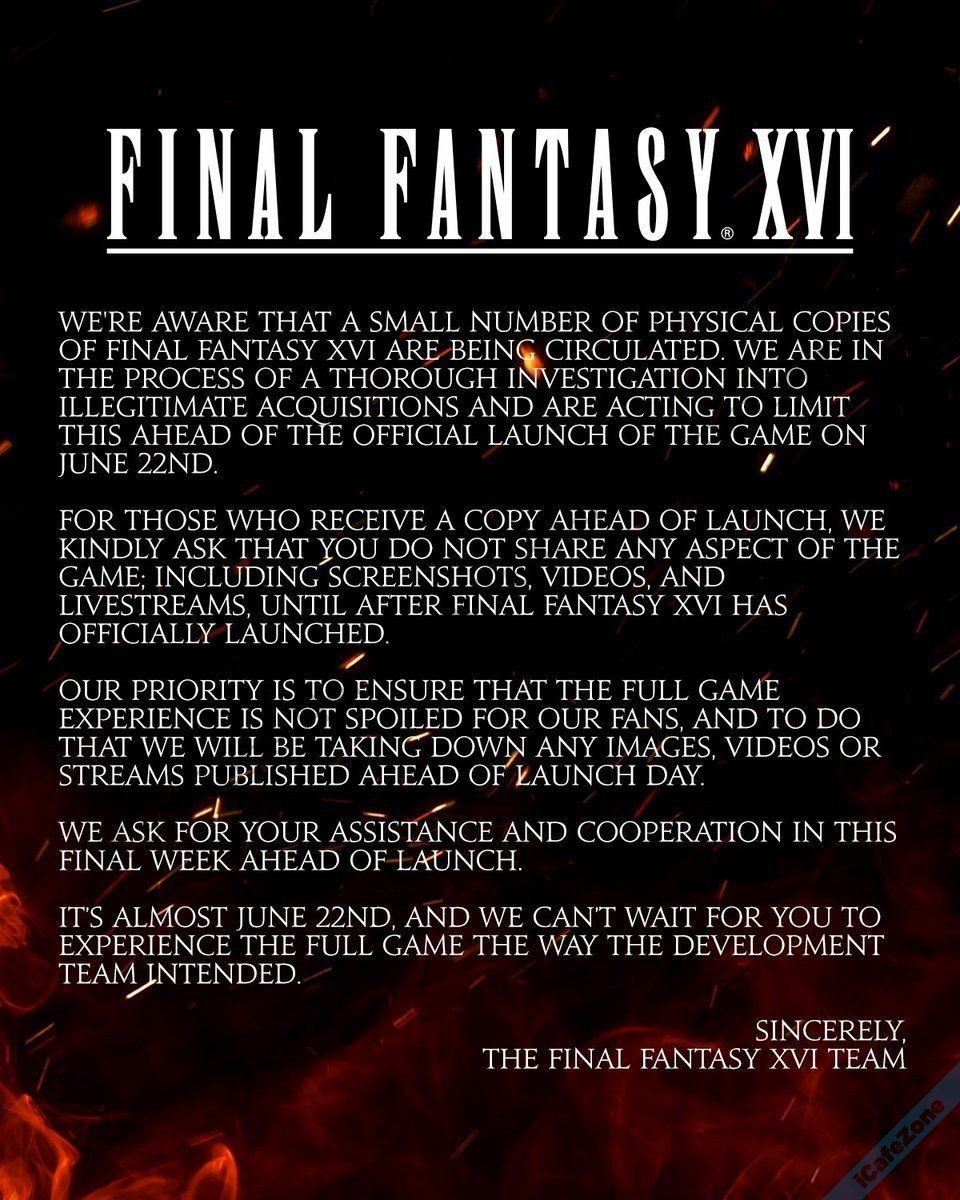 Square Enix ประกาศเตือนว่าแผ่นเกม Final Fantasy 16 หลุดออกก่อนวางขายจริง 22 มิถุนายนนี้ ทำให้อาจมีการแชร์เนื้อเรื่องของเกมก่อนได้ จึงขอให้แฟนๆ เกมไม่แชร์คลิป ภาพ ไลฟ์ที่เกี่ยวข้องกับเกม FF16 ก่อนกำหนด เพื่อป้องกันการสปอยล์เนื้อเรื่อง