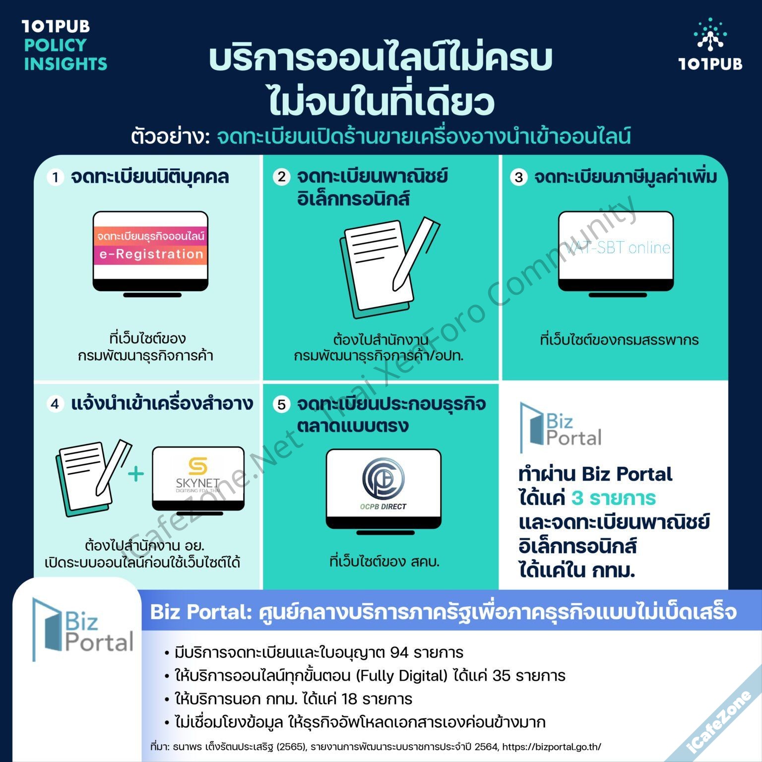 - บริการออนไลน์ยังแยกส่วนกันมาก ตัวอย่างการเปิดร้านออนไลน์ขายเครื่องสำอางนำเข้า ผู้ประกอบการต้องจดทะเบียน 5 ใบกับหน่วยงานรัฐ 5 หน่วย ผ่าน 4 เว็บไซต์ (กรมพัฒนาธุรกิจการค้า, กรมสรรพากร, สำนักงานคณะกรรมการอาหารและยา, สำนักงานคณะกรรมการคุ้มครองผู้บริโภค) เหตุผลที่เป็น 4 เว็บไซต์ เพราะการจดทะเบียนพาณิชย์อิเล็กทรอนิกส์โดยต้องเดินทางไปสำนักงานเขตหรือองค์กรปกครองส่วนท้องถิ่นเท่านั้น ทำผ่านเว็บไม่ได้ ส่วน อย. ต้องไปลงทะเบียนที่สำนักงานก่อนถึงจะออนไลน์ได้