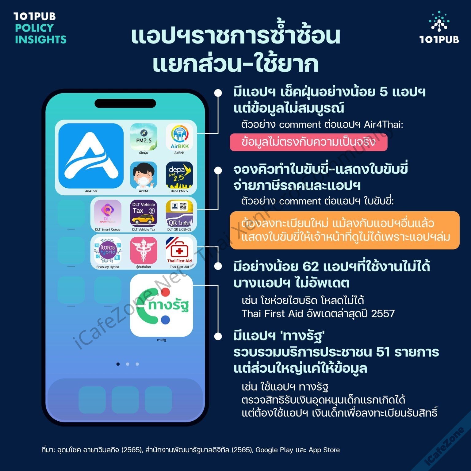 - การออกคำสั่งให้หน่วยงานรัฐทำแอพ (คำสั่งปี 2564) ทำให้เกิดแอพของรัฐแล้วอย่างน้อย 299 ตัว แต่เจอปัญหาหลายอย่าง เช่น ทำหน้าที่ซ้ำซ้อนกันเอง (มีแอพเช็คฝุ่น 5 ตัว แต่ข้อมูลไม่สมบูรณ์), มีแอพที่ใช้งานไม่ได้หรือไม่อัพเดต 62 ตัว, แอพบางตัวต้องลงทะเบียนใหม่ แม้ลงทะเบียนกับแอพอื่นแล้ว, แอพหลัก "ทางรัฐ" ของ DGA หวังจะเป็นแอพเดียวครบจบในตัว มีบริการ 51 อย่าง แต่ส่วนใหญ่ก็ให้ข้อมูลอย่างเดียว เช่น ตรวจสิทธิเงินอุดหนุนเด็กแรกเกิดได้ แต่การลงทะเบียนต้องใช้แอพอีกตัว