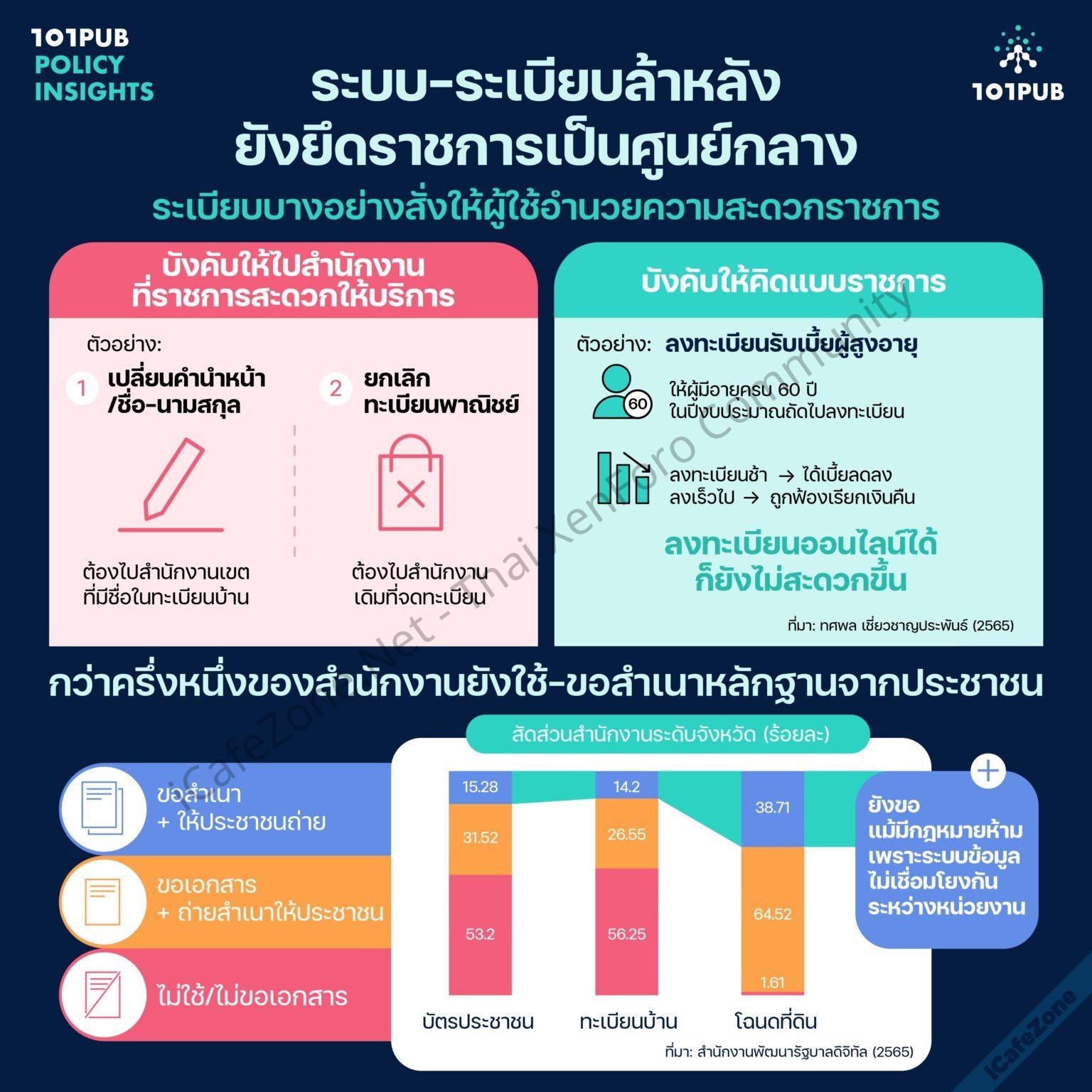 - ถึงแม้มีระเบียบห้ามขอสำเนาเอกสารจากประชาชนในปี 2560 แต่ยังมีหน่วยงานต้องขอสำเนาบัตรประชาชนอยู่ดี การสำรวจจาก DGA เมื่อปี 2565 ยังมีหน่วยงานระดับจังหวัด 46.8% ขอสำเนาบัตรประชาชน (ทั้งที่ให้ประชาชนนำมาเอง หรือมีบริการถ่ายสำเนาให้), 43.75% ขอสำเนาทะเบียนบ้าน และสำเนาโฉนดที่ดินเป็นเอกสารที่ยังต้องขอสำเนาเยอะมาก เกือบ 100% ของหน่วยงานที่ต้องใช้งาน