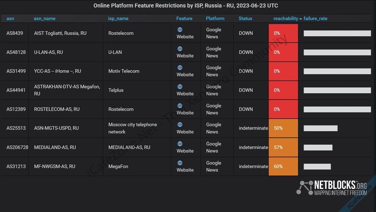 NetBlocks รายงานว่ารัสเซียได้บล็อกการเข้าถึง Google News ภายในประเทศ หลังจากประธานาธิบดี Vladamir Putin ระบุว่า Yevgeny Prigozhin หัวหน้ากองกำลังทหารรับจ้าง Wagner พยายามก่อกบฏ