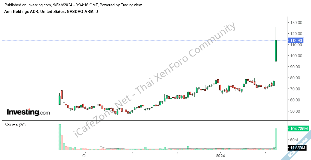 ราคาหุ้นของ Arm ปรับเพิ่มขึ้นถึง 48% เมื่อคืนนี้ หลังจากบริษัทรายงานผลประกอบการไตรมาส และประเมินผลการดำเนินงานไตรมาสปัจจุบันดีกว่าที่นักวิเคราะห์คาดไว้