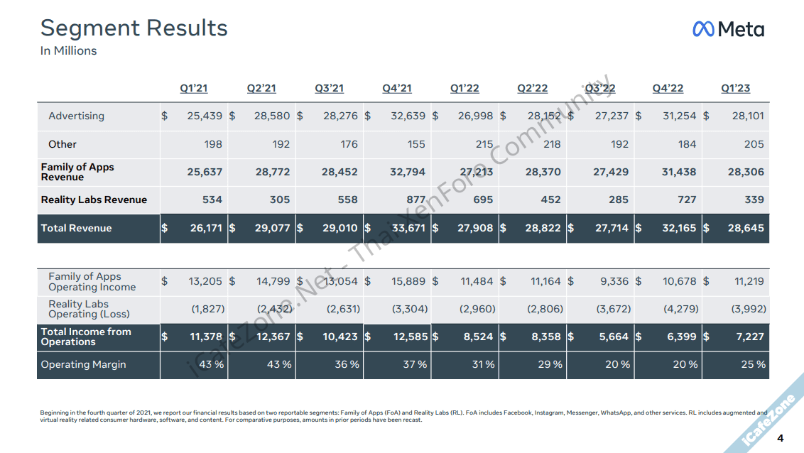 Meta รายงานผลประกอบการของไตรมาสที่ 1 ปี 2023 รายได้รวม 28,645 ล้านดอลลาร์ เพิ่มขึ้น 3% จากช่วงเดียวกันในปีก่อน ซึ่งเป็นการกลับมามีรายได้เพิ่มขึ้น หลังจากรายได้ลดลงติดต่อกันมาสามไตรมาส และมีกำไรสุทธิ 5,709 ล้านดอลลาร์