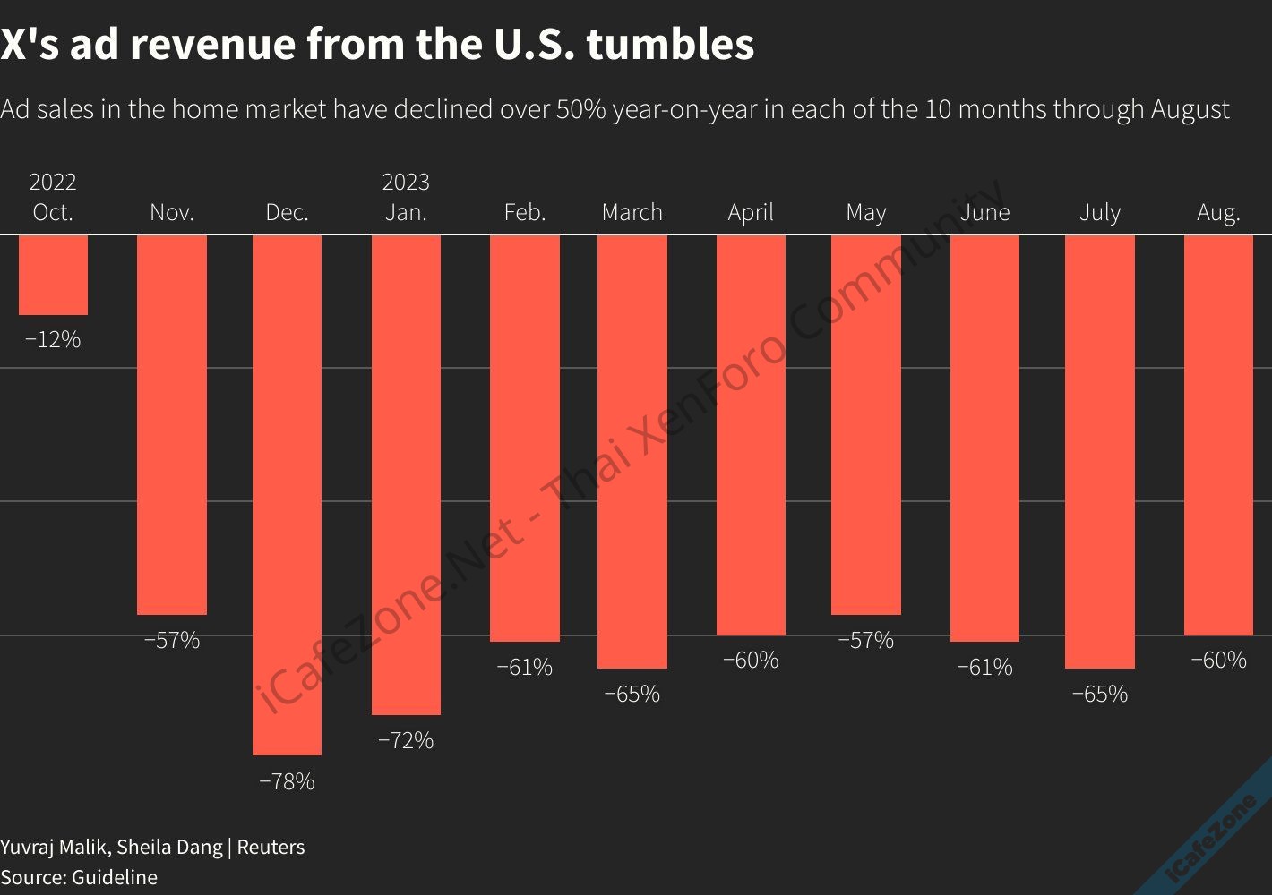 Reuters รายงานว่ารายได้จากโฆษณาบนแพลตฟอร์ม X ในสหรัฐฯ ลดลงอย่างน้อย 55% เมื่อเทียบกับปีที่ผ่านมาในแต่ละเดือน ตั้งแต่ Elon Musk เข้าซื้อบริษัท X เมื่อเดือนตุลาคม 2022