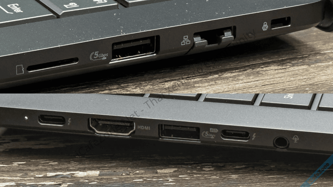 ในแง่ของพอร์ตเชื่อมต่อก็ให้มาอย่างครบครัน มีพอร์ต Thunderbolt 4 USB-C สองพอร์ต, USB-A สองพอร์ต, ช่อง MicroSD Card, HDMI และ LAN ซึ่งพอร์ตหลังสุดเริ่มหาได้ยากขึ้นทุกทีในแล็ปท็อปทั่วไป รวม ๆ แล้วด้านพอร์ตการเชื่อมนั้นเพียงพอสำหรับการใช้งานในสภาพแวดล้อมปัจจุบันแล้ว จุดที่ทีมงานชอบที่สุดคือการเปลี่ยนพอร์ตการชาร์จจากรูเฉพาะมาเป็น USB-C ทำให้รองรับการชาร์จด้วย Power Bank และสาย USB-C ที่มาตรฐานของปัจจุบัน (แต่ใช้อแดปเตอร์ตัวที่มาพร้อมกับเครื่องจะได้ประสิทธิภาพการชาร์จที่ดีที่สุด) ส่วนของคีย์บอร์ดและทัชแพดให้ประสบการณ์การพิมพ์ที่ดีมีระยะกดที่เหมาะสม