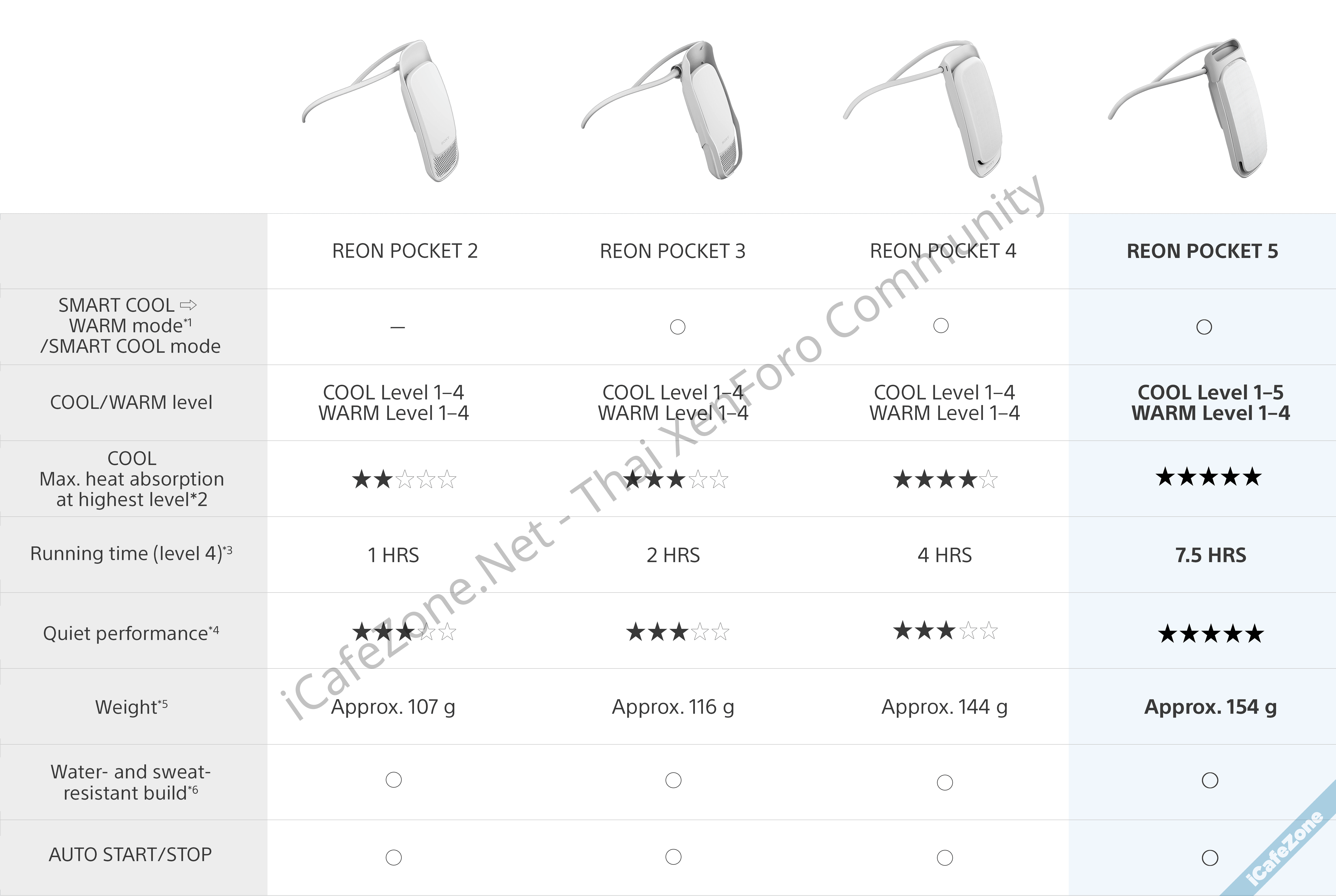 REON POCKET 5 เครื่องทำความเย็น/ความร้อนแบบพกพาจาก SONY รายละเอียดสเปคเครื่อง รุ่นนี้เพิ่มระดับความเย็นได้ถึง 5 ระดับ จากเดิมแค่ 4 ระดับ ทำความเย็นสูงขึ้น 1.5 เท่า ใช้เครื่องได้นาน 7.5 ชั่วโมง (เมื่อปรับความเย็นที่ระดับ 4)
