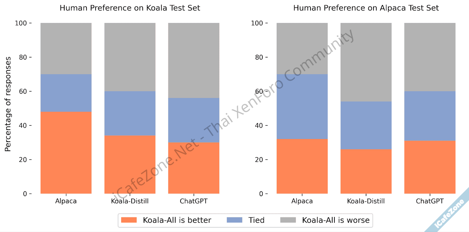 ผลการทดสอบโดยนำคำตอบจาก Koala มาเทียบกับโมเดลอื่นๆ ทั้ง ChatGPT และ Alpaca แล้วให้มนุษย์ 100 คนตัดสินแบบ blind test ว่าอันไหนดีกว่า (180 คำถามทดสอบ) พบว่าโมเดล Koala สามารถเอาชนะ Alpaca ได้แล้ว แต่ยังแพ้ ChatGPT อยู่ แต่ก็ถือว่าทำได้ดี แพ้ไม่ขาด ด้วยขนาดพารามิเตอร์ที่เล็กกว่ามาก