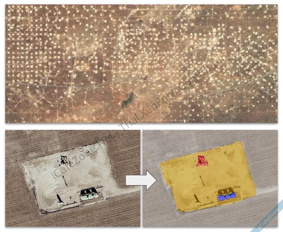 ตัวอย่างภาพถ่ายดาวเทียมแสดงบ่อน้ำมัน (จุดขาวในภาพบน) และการแยกแยะสิ่งปลูกสร้างในบ่อน้ำมันด้วย AI (สีแดง = ตัวปั๊ม, สีน้ำเงิน = ถังเก็บน้ำมัน)