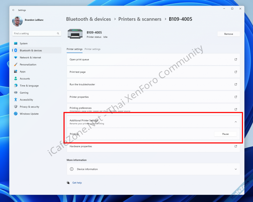 - หน้าจอตั้งค่า Settings > Printer สามารถสั่งหยุดพิมพ์ชั่วคราว (pause printing) สำหรับกรณีต้องเปลี่ยนหมึก หรือซ่อมบำรุงเครื่องระหว่างการสั่งพิมพ์ได้