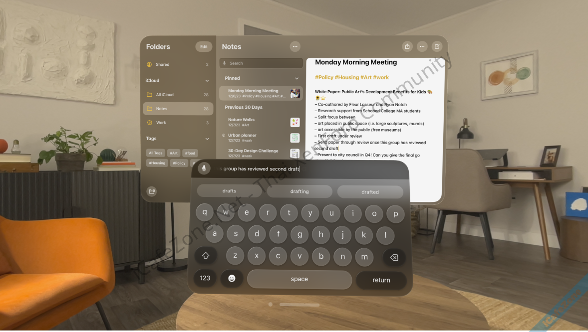 ปัจจุบันคีย์บอร์ดบน Vision Pro รองรับเฉพาะภาษาอังกฤษ (สหรัฐอเมริกา) และอีโมจิ