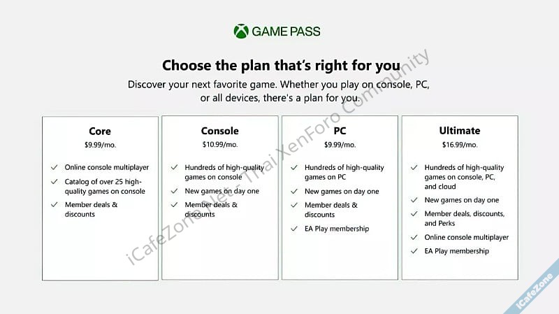 เท่ากับว่า Xbox Game Pass จะมีระดับสมาชิกทั้งหมด 4 ระดับได้แก่ Core, Console, PC และ Ultimate ส่วนในประเทศไทย จะมีเพียง PC Game Pass ในราคา 99 บาทต่อเดือนเท่านั้น เนื่องจากยังไม่มีการขายเครื่องเกมคอนโซล Xbox อย่างเป็นทางการ