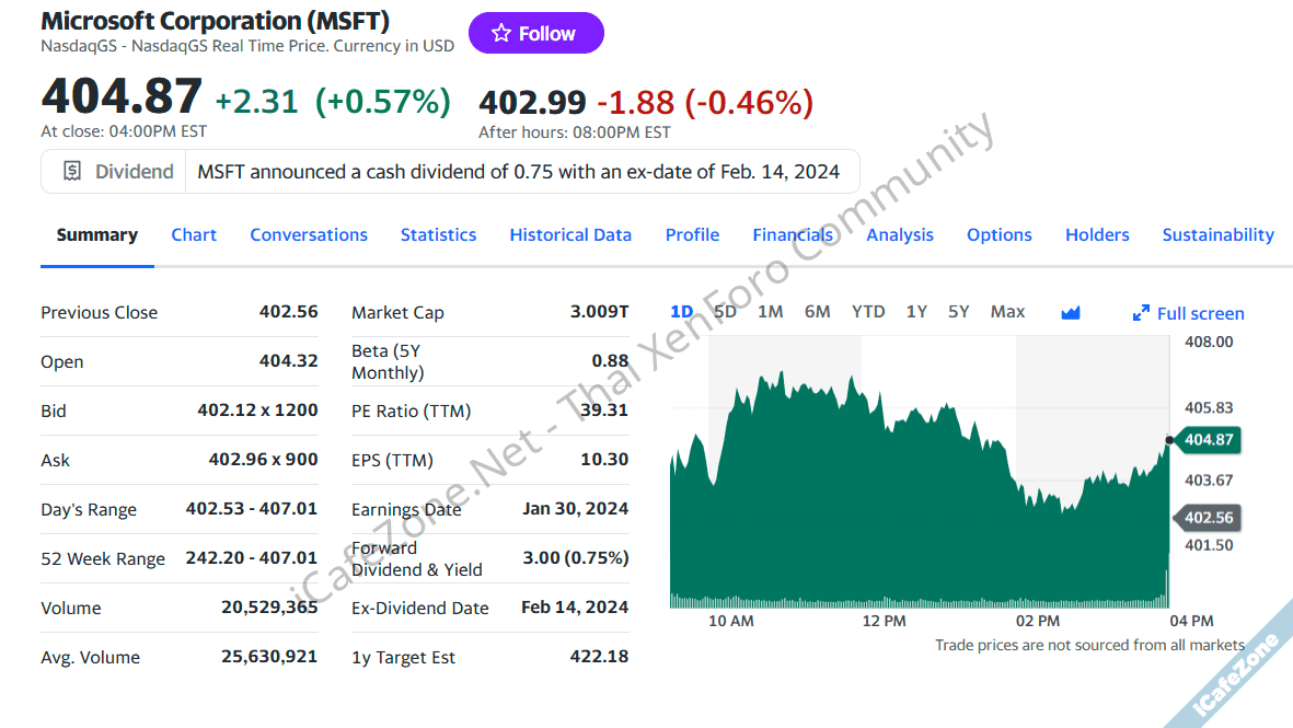 เมื่อคืนนี้มูลค่าบริษัทไมโครซอฟท์พุ่งเกิน 3 ล้านล้านดอลลาร์ได้เสร็จ ปิดตลาดด้วยมูลค่า 3.009 ล้านล้านดอลลาร์ แถมยังเป็นมูลค่าที่สูงกว่าแอปเปิลที่ราคาหุ้นลดลง มูลค่าตอนปิดตลาด 3.002 ล้านล้านดอลลาร์
